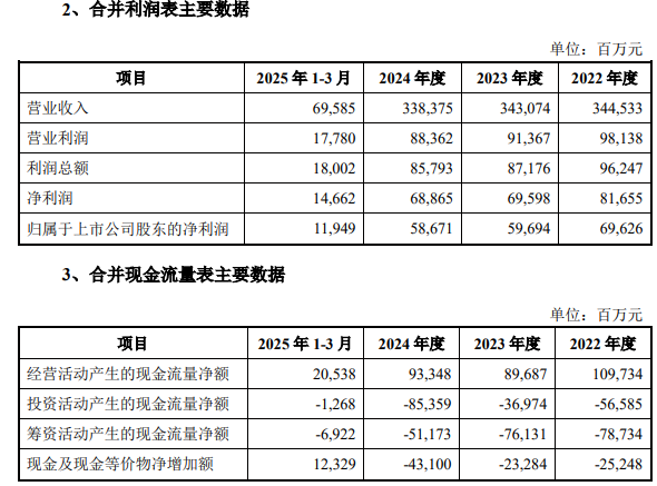 2022年至2024年,中国神华营业收入分别为3445.33亿元、3430.74亿元、3383.75亿元,净利润分别为816.55亿元、695.98亿元、688.65亿元,归属于上市公司股东的净利润分别为696.26亿元、596.94亿元、586.71亿元,经营活动产生的现金流量净额分别为1097.34亿元、896.87亿元、933.48亿元。