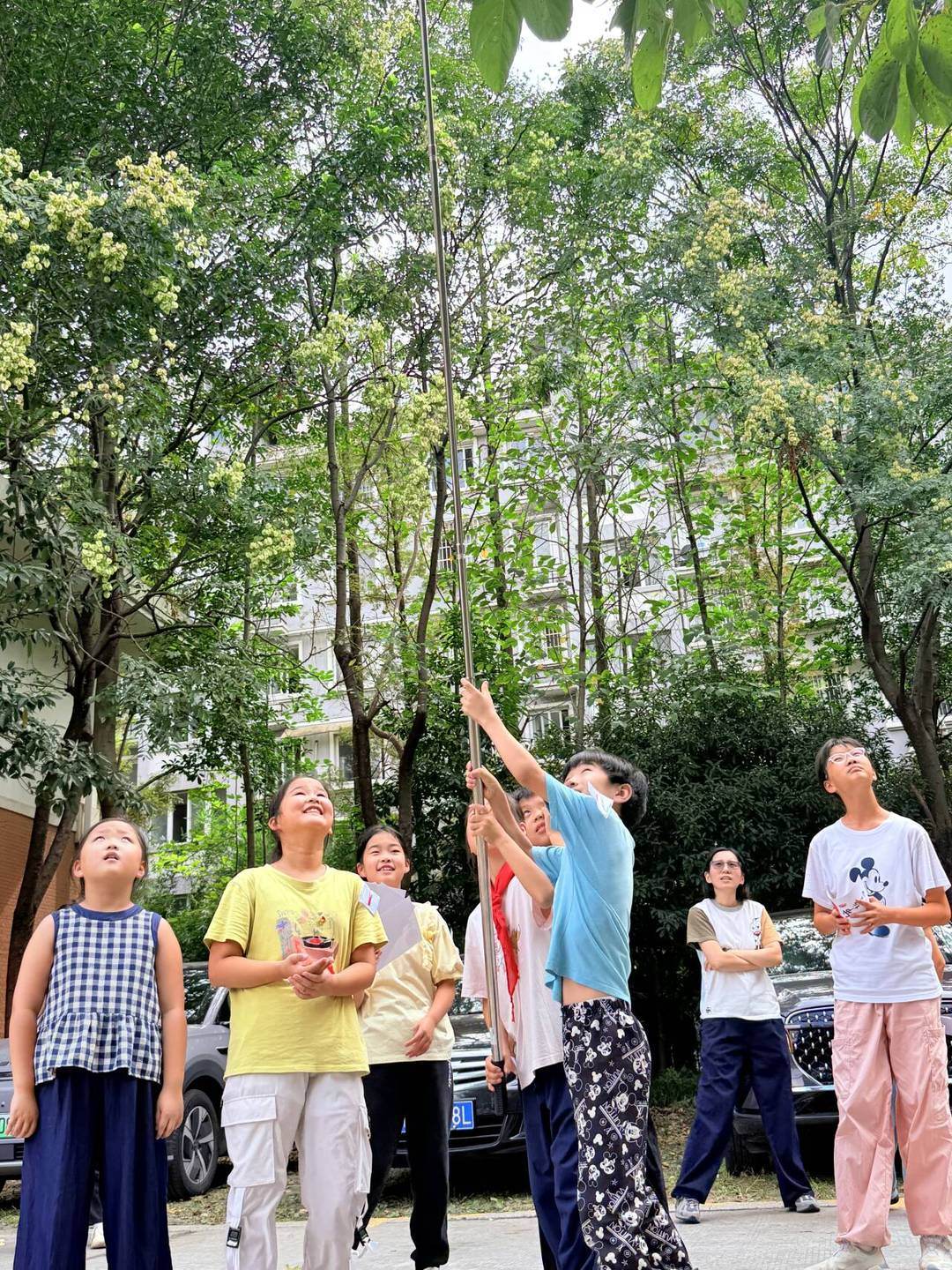 同学们手持长长的采摘杆,化身成“寻宝猎人”,在金黄与翠绿交织的叶丛中仔细探寻。